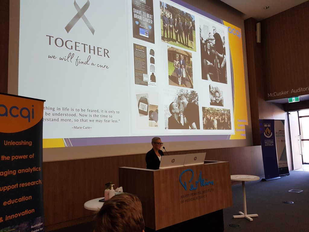 Patient advocate, Anita Parise, set the scene for the event, describing the journey she and her family has had since her husband Anthony was diagnosed with glioblastoma during 2021. Anita and her supporters raised and donated $16,000 for the work of the UWA Medical Physics Group and ACQI, through activities including shaving her hair and selling beanies through their fundraiser entitled “FUBC!”, which she insists stands for “Fully Understanding Brain Cancer”.