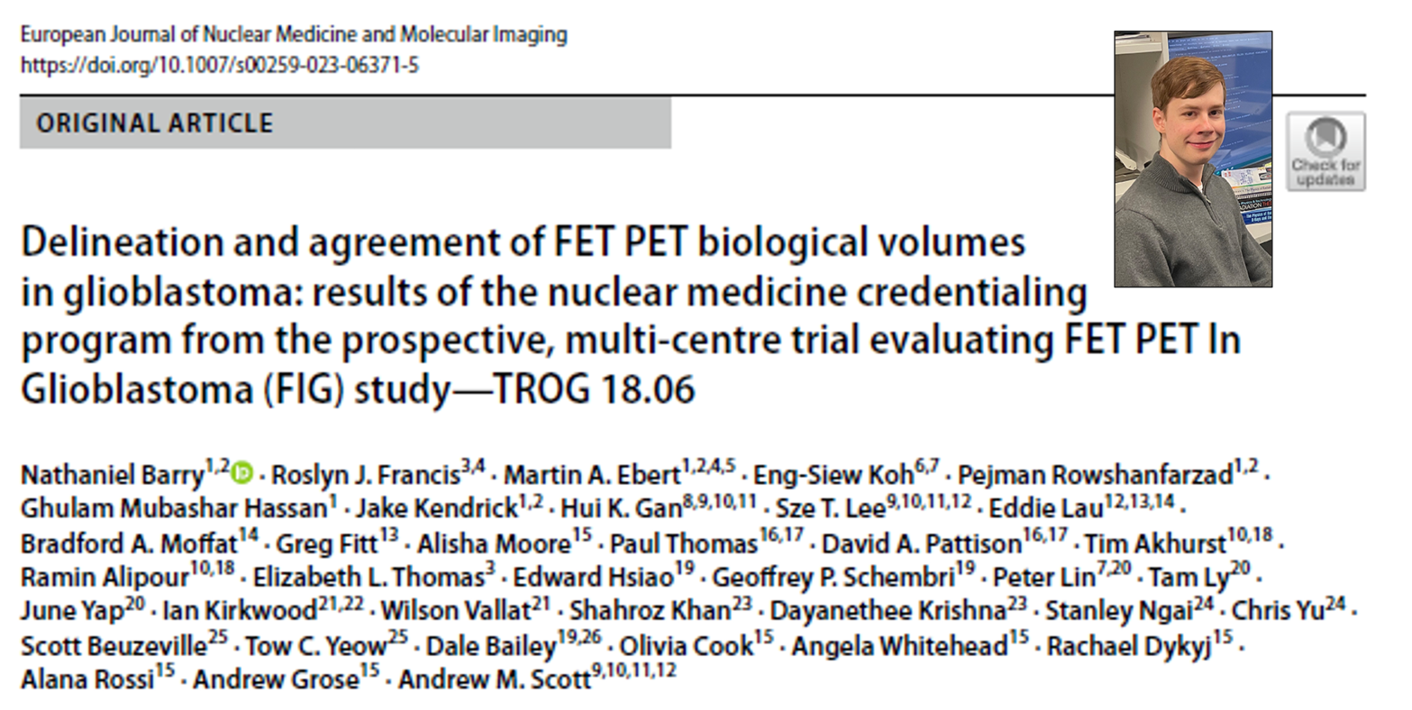 ACQI-affiliated PhD student Nathaniel Barry has authored a study published in the European Journal of Nuclear Medicine and Molecular Imaging which sets the scene for quantitative evaluation of the use of advanced radiotracers in the treatment of glioblastoma (GBM – high-grade glioma). Nathaniel coordinated the analysis of multi-clinician assessment of “FET PET” imaging for GBM, an imaging tracer that is currently being investigated in the national multi-centre “FIG” trial. Nuclear Medicine Physicians accruing participants to the trial were asked to assess a series of sample patient imaging datasets, with those assessments forming crucial components of each participant’s treatment and follow-up processes. Nathaniel was able to reveal where the inconsistencies occurred in such assessments, and that such inconsistencies were reduced through appropriate feedback to clinicians, greatly increasing the quality of treatments being offered to GBM patients. Nathaniel has also been able to quantify the impact of inter-clinician variability in image interpretation. This information will inform the modelling to be performed on imaging data acquired during the trial, and which will be use to optimise the use of FET PET in future patient treatments.