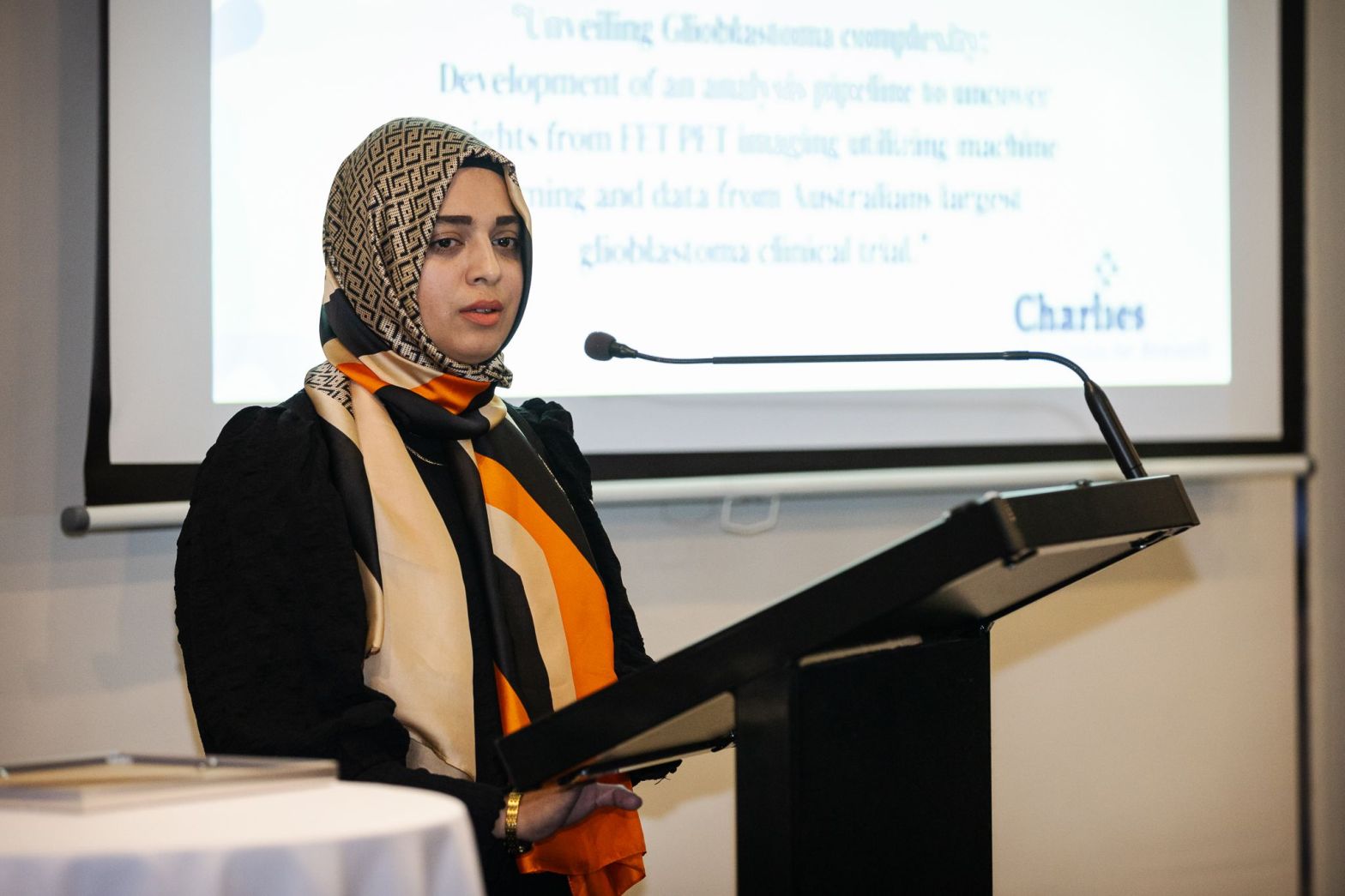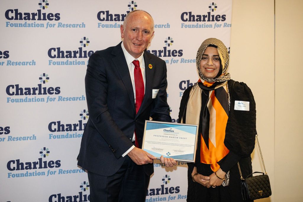 The research being undertaken by ACQI has been given a funding boost, having been awarded a $100k Transformational Grant by the Charlies Foundation for Research. ACQI Postdoctoral Fellow, Dr Saima Safdar, attended the Foundation awards night to be awarded the grant, to be used to develop computational pipelines to generate predictive models for disease progression from MR and PET imaging for patients with glioblastoma. Shown below, Dr Safdar receiving the grant award from WA Minister for Medical Research, Mr Stephen Dawson.