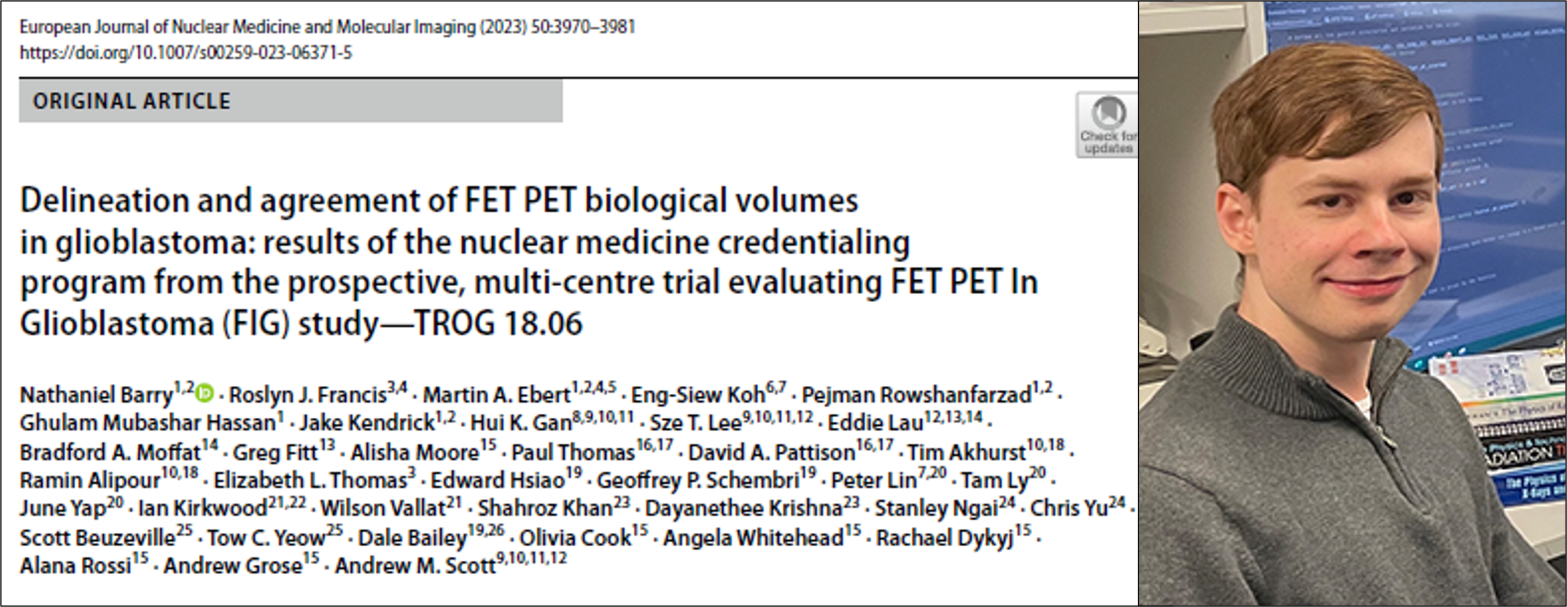 We were delighted that the high-profile online radiology news and information resource, Aunt Minnie, has promoted the work of our PhD student, Nathaniel Barry, in analysing credentialing data from the TROG 18.06 FIG trial in glioblastoma. This work resulted from an enormous multicentre national effort to develop this trial which is examining the role of advanced PET imaging radiotracers in the management of brain cancer. The FIG trial endeavours to provide the evidence required to ensure future glioblastoma patients can benefit from these new imaging modalities, and to generate the data needed to inform computational models to help guide and optimise treatment.