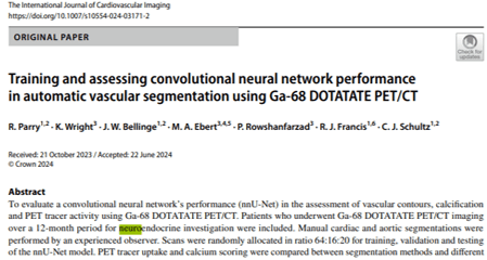ACQI members have recently collaborated with Cardiologists to undertake and publish a study in the International Journal of Cardiac Imaging to automatically identify blood vessels surrounding the heart. This is in order to re-purpose the PET imaging tracer 68Ga-Octeotrate, traditionally used for identifying tumours of the neuroendocrine system, for use in identifying and tracking cardiac atherosclerosis. Nuclear Medicine advanced trainee Reece Parry led analysis of retrospectively-collected imaging data for neuroendocrine tumour patients. With the assistance of ACQI researchers, deep learning methods were developed and tested for the automated delineation of cardiac vessels. This opens the door to consistent quantitative characterisation of calcification of coronary vessels for establishing cardiac health risk and predicting future risk.